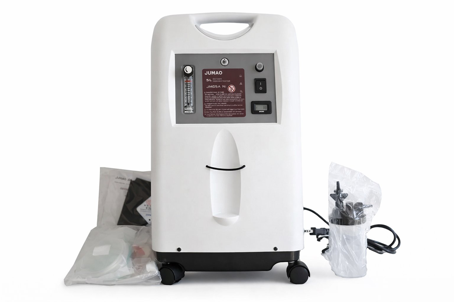 Concentrador de oxígeno JUMAO® 5 LPM, humidificador, cánula nasal para adulto, manguera de oxígeno, filtro de aire, adaptadores de conexión y manual de usuario original.